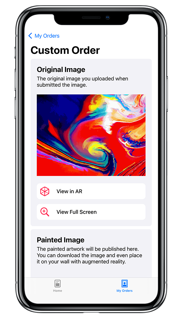 Receive your digital oil painting in less than 24 hours from placing an order. You will get an email once your order is complete, and you can check back on your account tab in the Pittura App to download your painting and order information.